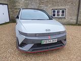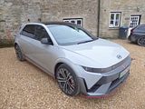 The Ioniq 5 N was introduced on 14 July 2023 during the Goodwood Festival of Speed. The variant is the top-of-the-line model, marketed under the Hyundai N performance sub-brand. The exterior changes include a revised front end with larger air intakes, with additional air curtains and air flaps for improved cooling. The rear portion gained a rear wiper, wing-type spoiler integrated with a triangular third brake light, and a rear diffuser. With extended wheel arches and wider track, the Ioniq 5 N is 50 mm (2.0 in) wider than the standard model and also 20 mm (0.8 in) lower. The larger front motor and front external speaker mean the Ioniq 5 N loses the front boot / trunk present in other Ioniq models. The body in white structure of the Ioniq 5 N gains 42 additional welding points and 2.1 m (83 in) of additional adhesives for improved rigidity. The motor and battery mountings were also reinforced, while the subframes were enhanced for lateral rigidity. Its power steering has a higher ratio and improved torque feedback. The vehicle is equipped with two electric motors, providing a total of 448 kW (609 PS; 601 hp) and 740 Nm (546 lb/ft) of torque. Hyundai equipped the Ioniq 5 N with an N Grin Boost mode, allowing a maximum output of 478 kW (650 PS; 641 hp) and 770 N⋅m (568 lb/ft) of torque being released for 10 seconds. Hyundai claimed a 0–100 km/h (0–62 mph) acceleration figure of 3.5 seconds, or 3.4 seconds with launch control or with N Grin Boost mode activated. The lithium-ion battery for this variant is also extended to 84 kWh. Several aspects were conceived to simulate an internal combustion vehicle. An N e-shift function emulates the feel of an 8-speed dual-clutch automatic transmission, by controlling motor torque to simulate the jolt between shifts. A similar system is utilised to simulate a clutch kick to initiate sliding when in N Drift Optimiser Pro mode. A system called N Active Sound+ uses eight interior and two exterior speakers to play three different sound themes based on throttle position, such as a 2.0-liter turbocharged petrol engine from other Hyundai N cars, futuristic EV themes and twin-engine fighter jet sounds. The car has ben widely praised as one of the most fun EVs yet produced.