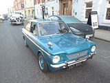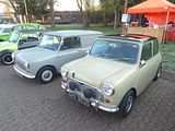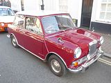 The Elf was one of a pair of Mini based models which BMC launched in 1961, the other being the Wolseley Hornet. Both had longer, slightly finned rear wings and larger boots that gave the cars a more traditional three-box design. Wheelbase of the Elf and Hornet remained at 2.036 m (6.68 ft), whereas the overall length was increased to 3.27 m (10.7 ft). This resulted in a dry weight of 638 kg for the Elf and 618 kg for the Hornet. Front-end treatment, which incorporated each marque’s traditional upright grille design (the Hornet’s grille with a lit “Wolseley” badge), also contributed to a less utilitarian appearance. The cars had larger-diameter chrome hubcaps than the Austin and Morris Minis, and additional chrome accents, bumper overriders and wood-veneer dashboards. The Riley was the more expensive of the two cars. The name “Wolseley Hornet” was first used on 1930s saloon, coupé, sports and racing cars, while the name “Elf” recalled the Riley Sprite and Imp sports cars, also of the 1930s (Riley’s first choice of name “Imp” could not be used as Hillman had registered it). The full-width dashboard was a differentiator between the Elf and Hornet. This dashboard was the idea of Christopher Milner the Sales Manager for Riley. Both the Riley Elf’s and Wolseley Hornet’s bodies were built at Fisher & Ludlow under their “Fisholow” brandname. Plates in the engine compartment on the right side fitch plate bear evidence of this speciality. Very early Mark I versions of both cars had no overriders on the bumpers and a single piece front wing (A-panel and wing in one piece, no outside seam below scuttle panel) that was soon given up again, allegedly due to cost. The Elf’s and Hornet’s special bumper overriders first appeared in 1962. Early production Mark I’s also had a combination of leather and cloth seats whereas all later models had full leather seats. Mark I models were equipped with single leading shoe brakes on the front. Both the Elf and the Hornet went through three engine versions. Initially, they used the 848 cc 34 bhp engine with a single HS2 carburettor, changing to a single HS2 carburettor 38 bhp version of the Cooper’s 998 cc power unit in the Mark II in 1963. This increased the car’s top speed from 71 to 77 mph . Therefore, Mark II cars also came with increased braking power in the form of front drum brakes with twin leading shoes to cope with the increased power output. Both Mark I and Mark II featured four-speed gearboxes (three synchromesh gears) with rod gear change, a.k.a. “magic wand” type. Automatic gearboxes became available on the Mark II in 1965 as an option. The Mark III facelift of 1966 brought wind-up windows and fresh-air fascia vents. Concealed door hinges were introduced two years before these were seen on the mainstream Mini. The gear selecting mechanism was updated to the rod type, as seen on all later Mini type cars. Automatic gearboxes were available to the Mark III in 1967 again. Full-four synchromesh gearing was eventually introduced during 1968. 30,912 Riley Elfs and 28,455 Wolseley Hornets were built. Production of both models ceased in late 1969.