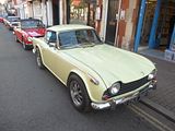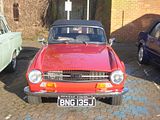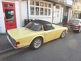 The TR’s smaller and cheaper brother was the Spitfire and there were a couple of examples from the later part of production. Based on the chassis and mechanicals of the Triumph Herald, the Spitfire was conceived as a rival to the Austin-Healey Sprite and MG Midget, which were launched a year earlier. The Triumph soon found a strong following, with many preferring it to the BMC cars which in time would become in-house stablemates. Mark II models arrived in 1965 and a more comprehensive facelift in 1967 with the distinctive “bone in mouth” front grille necessitated by US bumper height regulations also brought changes, but it was with the Mark IV that the greatest number of alterations would come about. The Mark IV featured a completely re-designed cut-off rear end, giving a strong family resemblance to the Triumph Stag and Triumph 2000 models, both of which were also Michelotti-designed. The front end was also cleaned up, with a new bonnet pressing losing the weld lines on top of the wings from the older models, and the doors were given recessed handles and squared-off glass in the top rear corner. The interior was much improved: a proper full-width dashboard was provided, putting the instruments ahead of the driver rather than over the centre console. This was initially black plastic however was replaced with wood in 1973. An all-new hardtop was also available, with rear quarter-lights and a flatter rear screen. By far the most significant change, however, was to the rear suspension, which was de-cambered and redesigned to eliminate the unfortunate tendencies of the original swing-axle design. The Triumph GT6 and Triumph Vitesse had already been modified, and the result on all these cars was safe and progressive handling even at the limit. The 75 hp engine was now rated at 63 hp (for UK market employing the 9:1 compression ratio and twin SU HS2 carburettors; the less powerful North American version still used a single Zenith Stromberg carburettor and an 8.5:1 compression ratio) due to the German DIN system; the actual output was the same for the early Mark IV. However, it was slightly slower than the previous Mark III due to carrying more weight, and employing a taller 3.89:1 final drive as opposed to the earlier 4.11:1. The engine continued at 1296 cc, but in 1973 was modified with larger big-end bearings to rationalise production with the TR6 2.5 litre engines, which somewhat decreased its “revvy” nature; there was some detuning, to meet new emissions laws, which resulted in the new car being a little tamer. With the overall weight also increasing to 1,717 lb (779 kg) the performance dropped as a consequence, 0 to 60 mph now being achieved in 15.8 seconds and the top speed reducing to 90 mph. The overall fuel economy also dipped to 32mpg. The gearbox gained synchromesh on its bottom gear. The Mark IV went on sale in the UK at the end of 1970 with a base price of £735. In 1973 in the United States and Canada, and 1975 in the rest of the world, the 1500 engine was used to make the Spitfire 1500. Although in this final incarnation the engine was rather rougher and more prone to failure than the earlier units, torque was greatly increased by increasing the cylinder stroke to 87.5 mm (3.44 in), which made it much more drivable in traffic. While the rest of the world saw 1500s with the compression ratio reduced to 8.0:1, the American market model was fitted with a single Zenith-Stromberg carburettor and a compression ratio reduced to 7.5:1 to allow it to run on lower octane unleaded fuel, and after adding a catalytic converter and exhaust gas recirculating system, the engine only delivered 53 bhp with a slower 0–60 time of 16.3 seconds. The notable exception to this was the 1976 model year, where the compression ratio was raised to 9.1:1. This improvement was short-lived, however, as the ratio was again reduced to 7.5:1 for the remaining years of production. In the UK the 9:1 compression ratio, less restrictive emissions control equipment, and the Type HS2 SU carburettors now being replaced with larger Type HS4 models, led to the most powerful variant to date. The 1500 Spitfire now produced 71hp (DIN) at 5500 rpm, and produced 82 lb/ft of torque at 3000 rpm. Top speed was now at the magical 100 mph mark, and 0 to 60 mph was reached in 13.2 seconds. Fuel economy was reduced to 29mpg. Further improvements to the suspension followed with the 1500 included longer swing axles and a lowered spring mounting point for more negative camber and a wider rear track. The wider, lower stance gave an impressive skid pad result of 0.87g average. This put the Spitfire head and shoulders over its competition in handling. The American market Spitfire 1500 is easily identified by the big plastic over-riders and wing mounted reflectors on the front and back wings. The US specification models up to 1978 still had chrome bumpers, but on the 1979 and 1980 models these were replaced by black rubber bumpers with built-in over-riders. Chassis extensions were also fitted under the boot to support the bumpers. Detail improvements continued to be made throughout the life of the Mark IV, and included reclining seats with “chequered brushed nylon centre panels” and head restraints, introduced for domestic market cars early in 1977 along with a new set of column stalk operated minor controls (as fitted already in the TR7) replacing the old dashboard mounted knobs and switches. Also added for the model’s final years were a wood dash, hazard flashers and an electric screen washer, in place of the previous manual pump operated ones.  Options such as the hard top, tonneau cover, map light and overdrive continued to be popular, but wire wheels ceased to be available. The 1980 model was the last and the heaviest of the entire run, weighing 1,875 lb (850.5 kg). Base prices for the 1980 model year was £3,631 in the UK. The last Spitfire, an Inca Yellow UK-market model with hardtop and overdrive, rolled off the a
