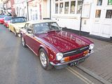 Replacement for the TR4 was – predictably – the Triumph TR5, which was built for a 13-month period between August 1967 and September 1968. Visually identical to the Michelotti styled TR4,the TR5 hid the main differences under the body. The most significant change from the TR4 was the 2.5-litre straight-6 fuel-injected engine, developing around 145 hp, and which was carried forward to the TR6. At the time, fuel injection (or PI petrol injection, as it was sometimes then called) was uncommon in road cars. Triumph claimed in their sales brochure that it was the “First British production sports car with petrol injection”. Sadly, it was also somewhat troublesome, with mechanical issues a common occurrence. A carburetted version of the TR5 named Triumph TR250 was manufactured during the same period, to be sold in place of the fuel injected car on the North American market. A few of these have now been brought over to the UK and indeed there were both TR250 and TR5 cars here. The Triumph TR250, built during the same period for the North American market, was nearly identical to the TR5. But, because of price pressures and emission regulations the TR250 was fitted with twin Zenith-Stromberg carburettors rather than the Lucas fuel injection system. The reasons for this difference came down to price pressures of the American market, and tighter emissions regulations. The TR250’s straight-six engine delivered 111 bhp , 39 bhp less than the TR5; 0–60 mph acceleration took 10.6 seconds. Standard equipment on both models included front disc brakes, independent rear suspension, rack and pinion steering and a four speed gearbox. Optional extras included overdrive and wire wheels. Both the TR5 and the TR250 were available with the “Surrey Top” hard top system: a weather protection system with rigid rear section including the rear window and removable fabric section over the driver and passenger’s heads.