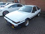 The AE86 series of the Toyota Corolla Levin and Toyota Sprinter Trueno are small, front-engine/rear-wheel-drive models within the front-engine/front-wheel-drive fifth generation Corolla (E80) range—marketed by Toyota from 1983 to 1987 in coupé and liftback configurations. Lending themselves to racing, the cars were light, affordable, easily modifiable and combined a five-speed manual transmission, optional limited slip differential, MacPherson strut front suspension, high revving (7800 rpm), twin-cam engine with oil cooler (e.g., in the US), near 50/50 front/rear weight balance, and importantly, a front-engine/rear-drive layout—at a time when this configuration was waning industry-wide. Widely popular for Showroom Stock, Group A, and Group N, Rally and Club racing, the cars’ inherent qualities also earned the AE86 an early and enduring international prominence in the motorsport discipline of drifting. The AE86 was featured centrally in the popular, long-running Japanese manga and anime series titled Initial D (1995–2013) as the main character’s drift and tofu delivery car. In 2015, Road & Track called the AE86 “a cult icon, inextricably interwoven with the earliest days of drifting.” The AE86 would go on to inspire the Toyota 86 (2012–present), a 2+2 sports car jointly developed by Toyota and Subaru, manufactured by Subaru—and marketed also as the Toyota GT86, Toyota FT86, Scion FR-S and Subaru BRZ. In November 2021, Toyota temporarily restarted the production of a limited number of parts for the AE86, with dealers beginning to take orders for new steering knuckle arms and rear brake calipers. Rear axle half shafts have also been scheduled for new production. Toyota has also announced that this reboot is temporary, and parts will only be available as long as stocks last. The nameplate Trueno derives from the Spanish word for thunder, and Levin derives from the Middle English for lightning. In Japan, the Sprinter Trueno was exclusive to Toyota Japan dealerships called Toyota Auto Store, while the Corolla Levin was exclusive to Toyota Corolla Store. The name AE86 derives from Toyota’s internal code during the car’s development, designating the 1600 cc RWD model from the fifth generation of the Corolla. In Toyota’s code language, the “A” designates the car’s engine (4A series), “E” designates Corolla, “8” designates fifth generation (E80 series) and “6” designates the variant within this generation. The AE86 is also called the “Hachi-Roku (ハチロク)”, Japanese for “eight-six”. Similarly the AE85 was commonly called “Hachi-Go (ハチゴー)”, meaning “eight-five”. Bracketing a minor external facelift, models marketed between 1983 and 1985 are called “zenki” (前期, lit. early period), and those marketed from 1986 to 1987 are called “kouki” (後期, lit. latter period). In 1986, Toyota marketed a limited edition model of the AE86 as the “Black Limited” model. It was advertised as a limited-production model with only 400 units, and was based on the Kouki Sprinter Trueno GT-APEX 3-door liftback. The AE86 was available with a naturally aspirated 4A-GE 1,587 cc inline-four engine, a DOHC four-valve-per-cylinder motor, in Japan and Europe, which was also used in the first-generation MR2 G Limited (AW11), Corona GT (AT141), Celica 1600GT-R (AA63) and Carina 1600GTR (AA63) (Japan only) with a compression ratio of 9.4:1. It had a maximum SAE gross power output of 130 PS (128 bhp) at 6,600 rpm and 110 lb/ft (149 Nm) at 5,200 rpm of torque in standard form, though it was later down-rated to 120 PS (118 hp) and 105 lb/ft (142 Nm) in net output. The 4A-GE engines used in the AE86 and AW11 were also equipped with Denso electronic port fuel injection and T-VIS variable intake geometry. In North America, a modified 4A-GEC engine was used to comply with California emissions regulations. Power was rated at 112 hp (114 PS) and 100 lb/ft (136 Nm) of torque. The AE86 used ventilated disc brakes. The car was equipped with a MacPherson strut style independent suspension at the front and a four-link live axle with coil springs for the rear as well as stabilizer bars, front and rear, and an optional LSD. The AE86 came with a 5-speed manual gearbox, and later came with the option of an automatic. Higher-spec American AE86 models known as the Sport GT-S featured the DOHC 4A-GEC engine, four-wheel disc brakes, had a T-series 6.7″ differential, colour-matched bumpers, front lower bumper surround with a much more sporty and pronounced lip, moulded door panels, tachometer redline at 7500 rpm, leather-wrapped steering wheel, seats with leather-wrapped tops (front seats are completely different from Sport SR5), optional LSD, and aluminium wheels. The VIN of the GT-S is AE88 (for North American market cars), however the chassis code on the engine firewall remained as AE86. The Sport GT-S can also be identified by the “Q” identification on the 4th digit of the model code, found on the chassis plate. Lower-spec American AE86 SR5 models used the 1,587 cc 4A-C SOHC unit, The S-series rear end was a 6.38″ non-LSD with drum brakes. The SR5 model also had a softer suspension, and small styling and interior changes such as seats, gauge cluster, door panels, un-painted matte black front and rear bumpers, the lower part of the front bumper surround is shorter and flat, and its VIN differs as well, being AE86 for the SR5 model (for North American market cars). The SR5 can also be identified by the “X” identification on the 4th digit of the model code, found on the chassis plate. Another lower-spec American AE86 model was the base-model DX, which had the same 1,587 cc (1.6 L) 4A-C SOHC unit and 6.38″ non-LSD rear end with drum brakes as the SR5. It had a smaller center console, no rear sway bars, no air-conditioning, a very basic interior, and many options present on the GT-S and SR5 that were unavailable in the DX. The DX was an internal Toyota de