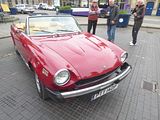 The first 124 Spider made its debut at the Turin Show in 1966, and continued in production until the mid 1980s, bearing the badge of its desginer, Pininfarina, in later years when it remained popular in the American market. Early cars had 1400 and 1600cc engines, and these were gradually enlarged first 1800cc and then 2 litre, with fuel injection being added for more power and emissions compliance during the 1970s. Fiat spotted the potential of the car for more than just boulevard cruising, though, so in November 1972 they announced the Fiat Abarth 124 Rally, an overtly sporting version. Its main purpose was to receive FIA homologation in the special grand touring cars (Group 4) racing class, and replaced the 1.6-litre Fiat Sport Spider rally car which had been campaigned. At the time, the 124 had already won the 1972 European Rally Championship at the hands of Raffaele Pinto and Gino Macaluso. The 124 Rally was added to the Sport Spider range, which included the 1600 and 1800 models; the first 500 examples produced were earmarked for the domestic Italian market. Amongst the most notable modifications over the standard spider there were independent rear suspension, engine upgrades, lightweight body panels, and a fixed hard top. In place of the usual rear solid axle, there was a Chapman-type McPherson strut independent suspension, supplemented by a longitudinal torque arm. At the front a radius rod on each side was added to the standard double wishbones. The Abarth-tuned type 132 AC 4.000 1.8-litre, twin-cam engine was brought from the standard 118 to 128 PS DIN by replacing the standard twin-choke carburettor with double vertical twin-choke Weber 44 IDF ones, and by fitting an Abarth exhaust with a dual exit exhaust The 9.8:1 compression ratio was left unchanged. The transmission was the all-synchronised 5-speed optional on the other Sport Spider models, and brakes were discs on all four corners. Despite the 20 kg (44 lb) 4-point roll bar fitted, kerb weight was 938 kg (2,068 lb), roughly 25 kg (55 lb) less than the regular 1.8-litre Sport Spider. The bonnet, boot lid and the fixed hard top were fibreglass, painted matt black, the rear window was perspex and the doors aluminium. Front and rear bumpers were deleted and replaced by simple rubber bumperettes. A single matte black wing mirror was fitted. Matte black wheel arch extensions housed 185/70 VR 13 Pirelli CN 36 tyres on 5.5 J × 13″ 4-spoke alloy wheels. Inside, the centre console, rear occasional seats, and glovebox lid were eliminated; while new features were anodised aluminium dashboard trim, a small three-spoke leather-covered Abarth steering wheel, and Recaro corduroy-and-leather bucket seats as an extra-cost option. The car carried Fiat badging front and rear, Abarth badges and “Fiat Abarth” scripts on the front wings, and Abarth wheel centre caps. Only three paint colours were available: Corsa red, white, and light blue.