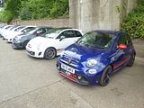 The vast majority of Abarth cars here were the 500-based models which have been on sale now since the end of 2008, following a launch at the Paris Show that year. Since that time there have been a number of detailed changes to the standard cars and a lot of limited editions. Those who really know the marque can spot most of them, but some are so subtle that unless there is a badge you can see, you will not be quite sure which version you are looking at. It used to be relatively easy, when the model was first launched, as there was only one version as shipped ex works called the 500. It had a 135 bhp 1.4 litre turbo-charged engine coupled to a five speed manual gearbox, with 16″ alloys as standard, and the option of 17″ wheels, and a colour palette comprising of two whites (BossaNova White, the standard colour, or the pearlescent Funk White), Red (Pasadoble), Pale Grey (Campovolo) or Black. If you wanted more power – 160 bhp – then you could order an Esseesse kit, which came in a large wooden crate, containing new wheels, springs, an ECU upgrade, the Monza exhaust system and badging. It was dealer fitted and could be applied at any time within the first 12 months or 10,000 miles from registration. Needless to say, it proved popular. As were many of the optional extras, with stickers for the sides, a large scorpion for the bonnet and even a chequered pattern for the roof among the personalisation options offered. Several of the original style of cars were here.