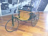 Seemingly a permanent part of the displays here, although it does move around the site a but is this, one of a number of replicas of the 1886 Patent MotorWagen. The Benz Patent-Motorwagen (“patent motorcar”), built in 1885 by the German Karl Benz, is widely regarded as the first practical modern automobile and was the first car put into production. It was patented and unveiled in 1886. The original cost of the vehicle in 1886 was 600 imperial German marks. After developing a successful gasoline-powered two-stroke piston engine in 1873, Benz focused on developing a motorized vehicle while maintaining a career as a designer and manufacturer of stationary engines and their associated parts. The Benz Patent-Motorwagen was a motor tricycle with a rear-mounted engine. The vehicle contained many new inventions. It was constructed of steel tubing with woodwork panels. The steel-spoked wheels and solid rubber tires were Benz’s own design. Steering was by way of a toothed rack that pivoted the unsprung front wheel. Fully elliptic springs were used at the back along with a beam axle and chain drive on both sides. A simple belt system served as a single-speed transmission, varying torque between an open disc and drive disc. The first Motorwagen used the Benz 954 cc single-cylinder four-stroke engine with trembler coil ignition. This new engine produced 500 watts (2⁄3 hp) at 250 rpm in the Patent-Motorwagen, although later tests by the University of Mannheim showed it to be capable of 0.9 bhp at 400 rpm. It was an extremely light engine for the time, weighing about 100 kg (220 lb). Although its open crankcase and drip oiling system would be alien to a modern mechanic, its use of a pushrod-operated poppet valve for exhaust would be quite familiar. A large horizontal flywheel stabilized the single-cylinder engine’s power output. An evaporative carburettor was controlled by a sleeve valve to regulate power and engine speed. The first model of the Motorwagen had not been built with a carburettor, rather a basin of fuel soaked fibres that supplied fuel to the cylinder by evaporation. The vehicle was awarded the German patent number 37435, for which Karl Benz applied on 29 January 1886. Following official procedures, the date of the application became the patent date for the invention once the patent was granted, which occurred in November of that year. Benz unveiled his invention to the public on 3 July 1886, on the Ringstrasse in Mannheim. For the first time Karl Benz publicly drove the car on July 3, 1886, in Mannheim at a top speed of 16 km/h (10 mph). Benz later made more models of the Motorwagen: model number 2 had 1.5 hp engine, and model number 3 had 1.5 kW (2 hp) engine, allowing the vehicle to reach a maximum speed of approximately 16 km/h (10 mph). The chassis was improved in 1887 with the introduction of wooden-spoke wheels, a fuel tank, and a manual leather shoe brake on the rear wheels. About 25 Patent-Motorwagen were built between 1886 and 1893. Bertha Benz, Karl’s wife, whose dowry was said to have made a portion of contribution to finance the development of the Patent-Motorwagen, was aware of the need for publicity. She took the Patent-Motorwagen No. 3 and drove it on the first long-distance internal combustion automobile road trip to demonstrate its feasibility. That trip occurred in early August 1888, when she took her sons Eugen and Richard, fifteen and fourteen years old, respectively, on a ride from Mannheim through Heidelberg, and Wiesloch, to her maternal hometown of Pforzheim. In Germany, a parade of antique automobiles celebrates this historic trip of Bertha Benz every two years. On February 25, 2008, the Bertha Benz Memorial Route, following the route of Benz’s journey, was officially approved as a Tourist or Scenic Route by the German authorities as a route of industrial heritage of mankind. The 194 km (121 mi) of signposted route leads from Mannheim via Heidelberg to Pforzheim (Black Forest) and back.